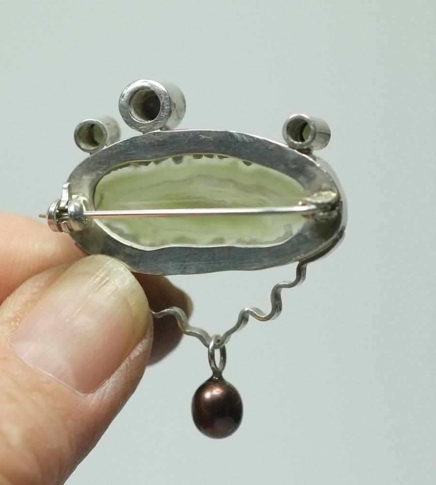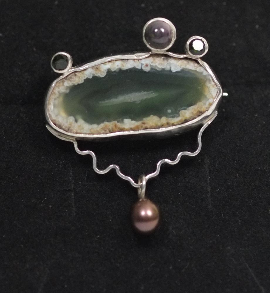 Zilveren fantasie broche met doorzichtige groene agaat. En bovenop 2 kleine donker groenen toermalijn steentjes en een paars/groene ronde agaat. Onderop hangt een zwarte zoetwater parel. Achterop een brochespeld.
